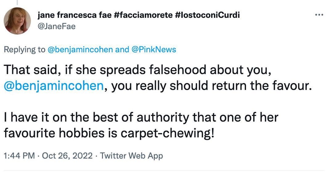 They just can’t hide their venomous hatred of lesbians. Beautifully, this was in response to Ben Cohen’s bizarre threat against Kemi Badenoch, in which he seems unaware that people can use Google to check these things.