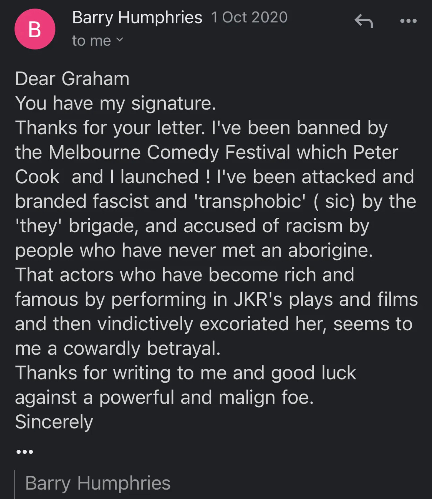 Those who knew him well can expound on his friendship, wisdom, and poise. My acquaintance with him was about as fleeting as it was possible to get and yet I feel all those qualities manifested in the single email I received from him. A couple of years ago, Stella O’Malley and I wrote a letter defending JK Rowling from the death and rape threats sent to her by trans rights activists. I thought it would be an easy and safe way for comedians to stand up against the rising authoritarianism of the hysterical, misogynist Left. But hardly a single comedian of my acquaintance signed it.