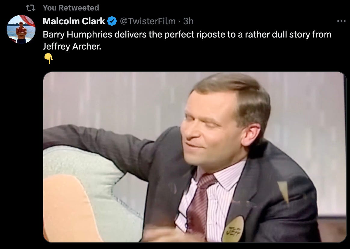 I’m not going to pay tribute to the comic genius of the late Barry Humphries because there are others doing a much better job of it already. I didn’t know him at all, except in the way we all knew him, through his appearances as Dame Edna and Sir Les Paterson on countless TV appearances that we all took for granted growing up, moments that are going viral all over again, because almost everything he said was funny.