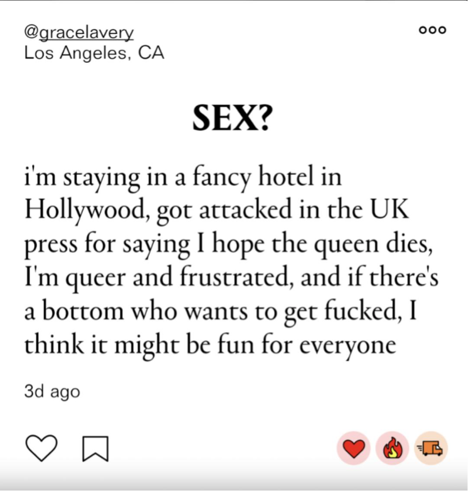 But there is a darker side to Lavery’s need for attention. In order to shock his detractors and titillate his fans, he regularly posts about his sex life, including photos of his ‘husband’ with Lavery’s fist in her mouth and with bruises.
