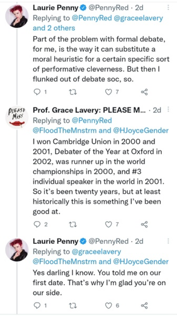 Despite being the most celebrated debater of all time, as he recently reminded ex-girlfriend Laurie Penny, Lavery is notably unable to define or argue a coherent position when faced with the mildest of scepticism. In this Heterodorx podcast with Corinna Cohn and Nina Paley from 2021, Lavery waffles in a non-committal way until even the friendly interviewers get frustrated by his evasiveness.
