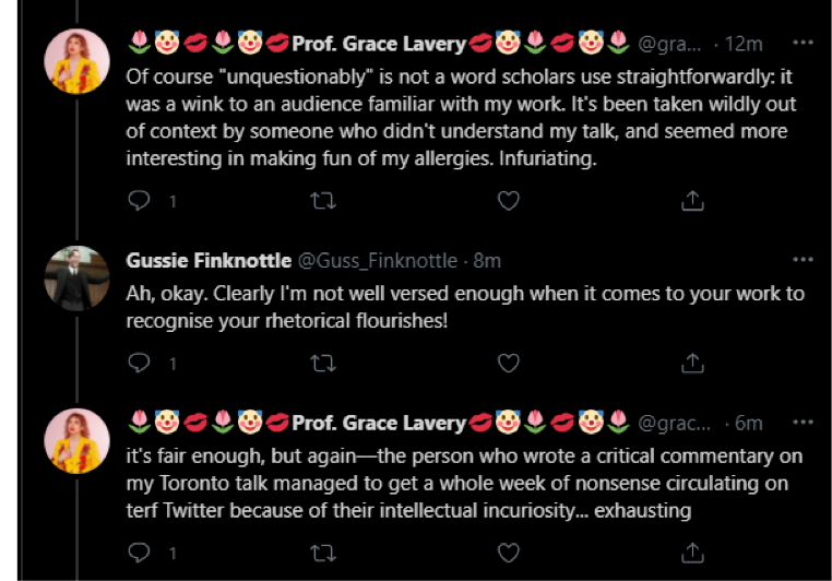 Grace is seen as a liability by some in the trans activist community because of behaviour such as this, and his original willingness to debate gender with gender critical thinkers. His lack of self-control also means he often says the quiet bit out loud.