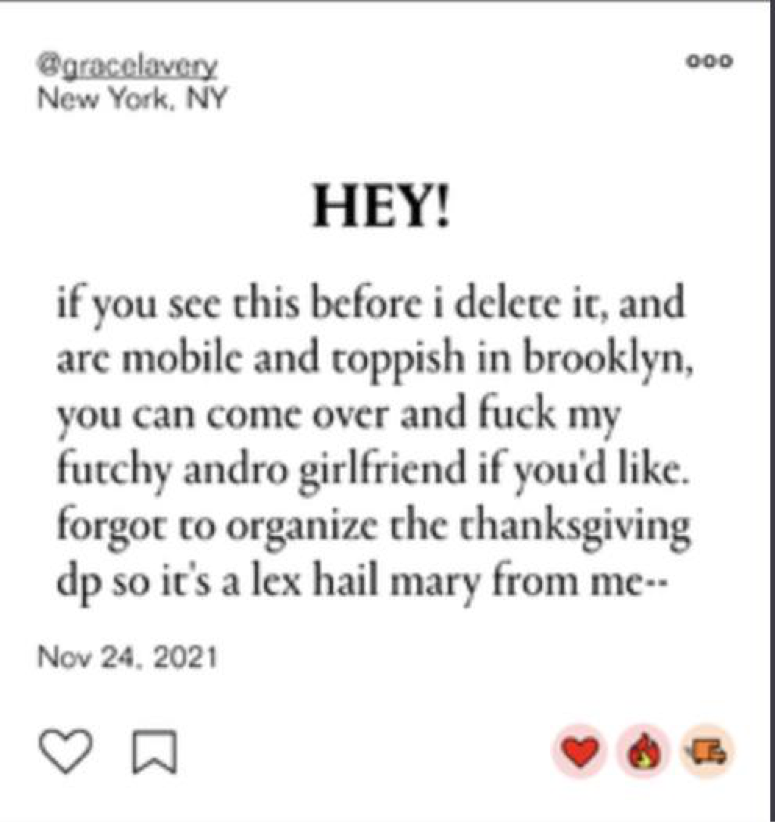 Perhaps in response to ‘Daniel’s’ resistance to Lavery’s attempts at Yoko’ing, Lavery has become openly infatuated with other people, including a new girlfriend. He now uses the ‘queer’ text-based dating app, Lex, to procure partners to have sex with his girlfriend while he watches, or to advertise for partners on whom to take out his current frustration.