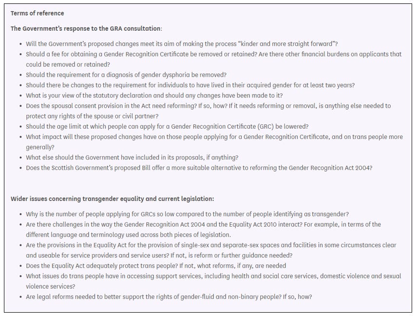 As Kathleen Stock points out, the previous GRA Inquiry was a ‘total stitch-up’. Her WPUK talk in the House of Lords from 2018 highlights its failures.