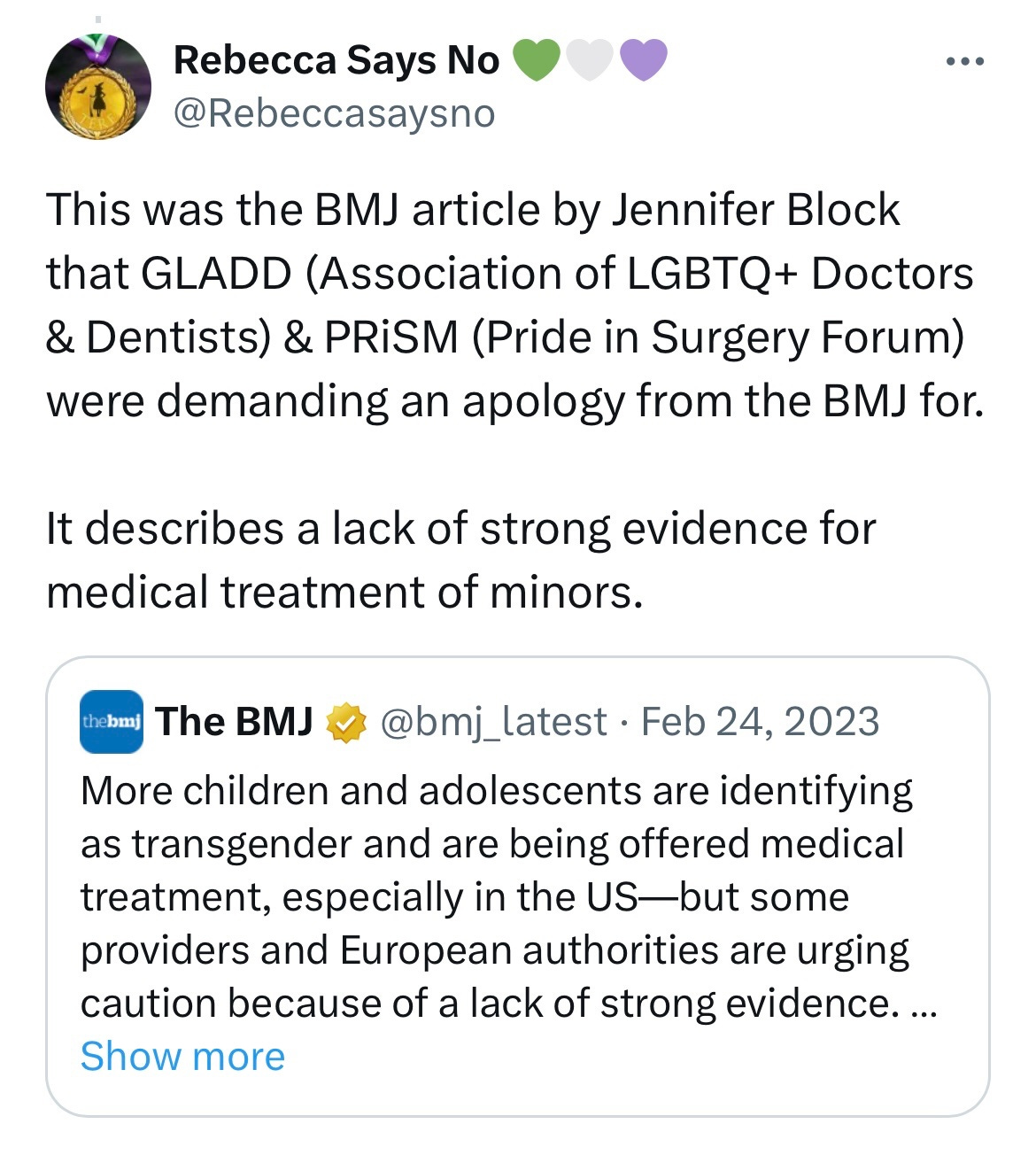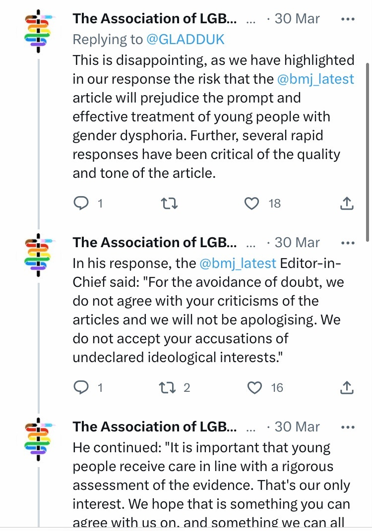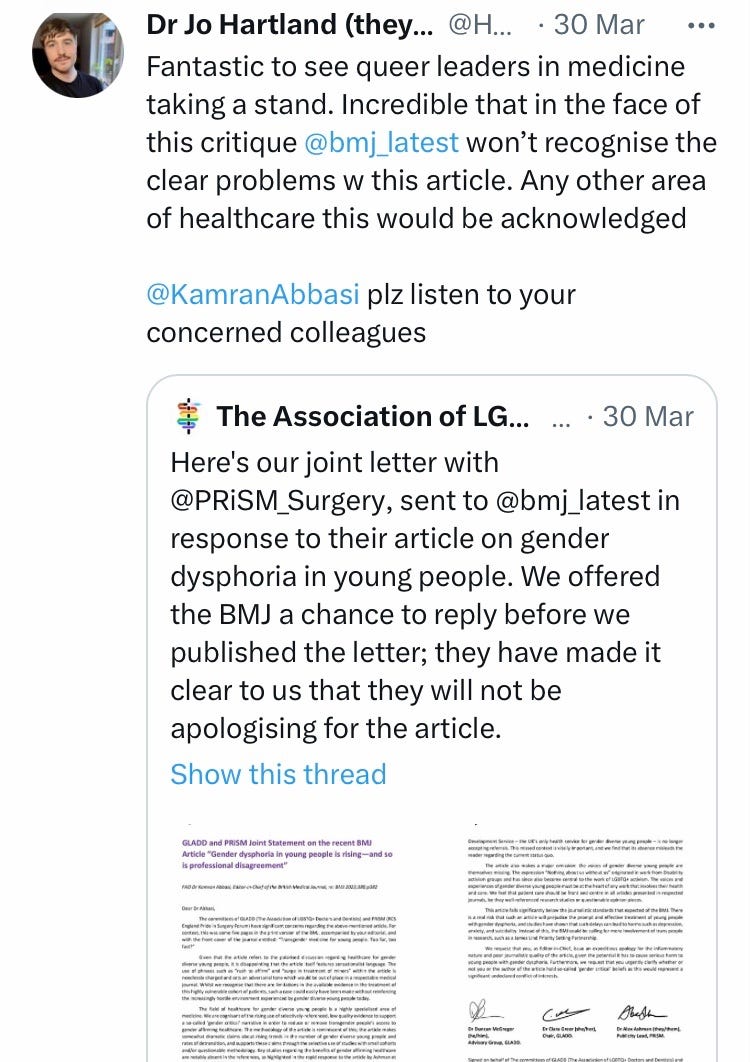 In February 2023, Jennifer Block’s article Gender dysphoria in young people is rising—and so is professional disagreement urged caution due to the lack of strong evidence for gender treatment in minors. This provoked furious responses from many activist doctor groups including the BMA, GLADD UK (Association of LGBTQ+ Doctors and Dentists) and PRiSM (Pride in Surgery Forum, subgroup of the Royal College of Surgeons), who went as far as trying to have the article removed.