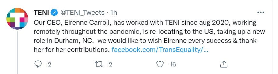 “What on EARTH is going on with the discredited, state-funded, private trans lobby group TENI? Today they lost over half their staff. Is something afoot I wonder? Firstly they lost their American CEO Shoshanna Carroll.