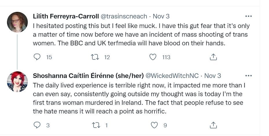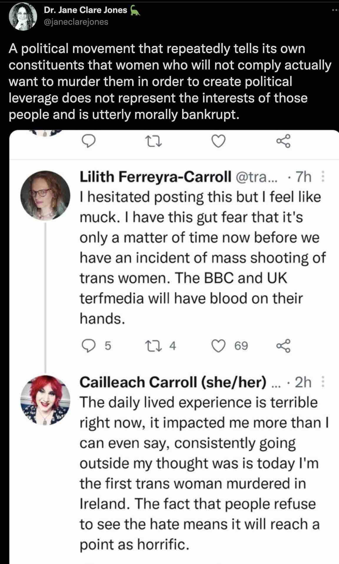 It often seems that TRAs want, no, need violence and death to happen to one of them. Without it, the claim that they are "the most vulnerable" in society doesn't hold water. The drama over the previously unknown Lily Cade's bizarre rantings this week shows that they will latch on to any chance of saying "See, we told you so!"