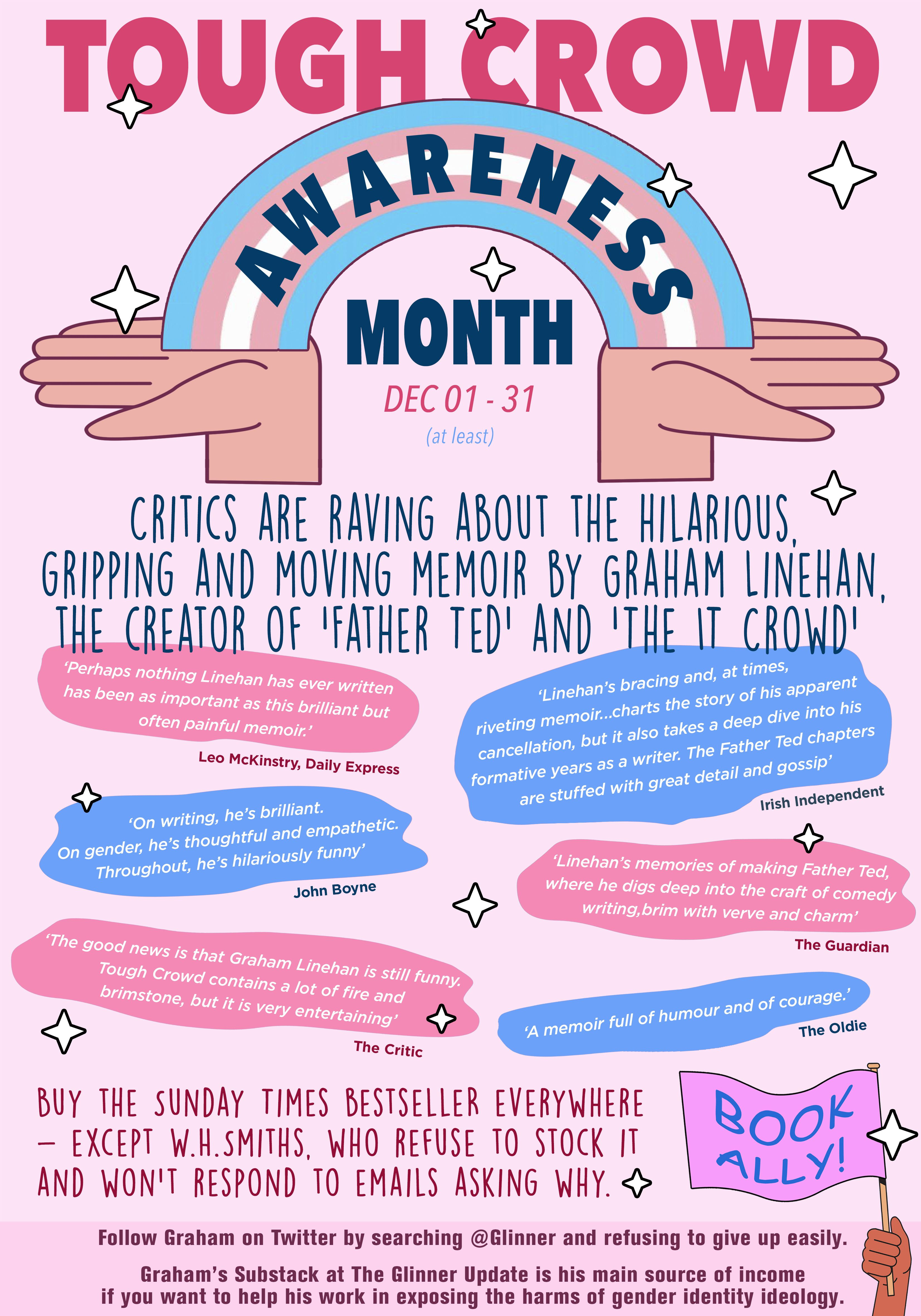 So I’m turning to you, gentle reader. Please do spread word of the book any way you can, and more importantly, let people know that it’s not all about gender ideology! Although my account of my exile from polite society is the heart of this story (and will, I hope, peak anyone who reads it) I had a whole life of creating comedy before it. At least half of Tough Crowd is about how we wrote and made Father Ted, IT Crowd Black Books and other shows.