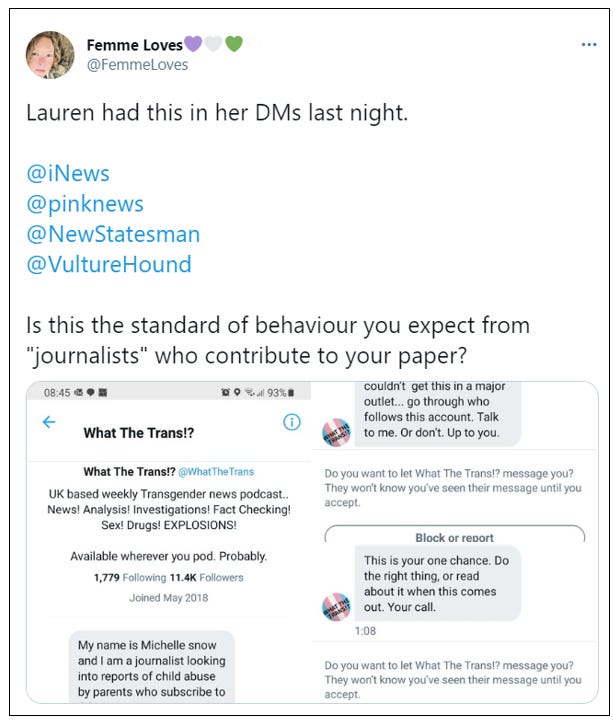 In pursuit of the ‘ROGD parent story’, Snow also sent aggressive DMs to Fionne Orlander, a transwoman critical of gender ideology.