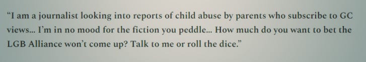 A ‘journalist’ who sends menacing DMs in an effort to blackmail and intimidate those who challenge gender identity ideology writes almost exclusively for Pink News? Colour me not remotely surprised.