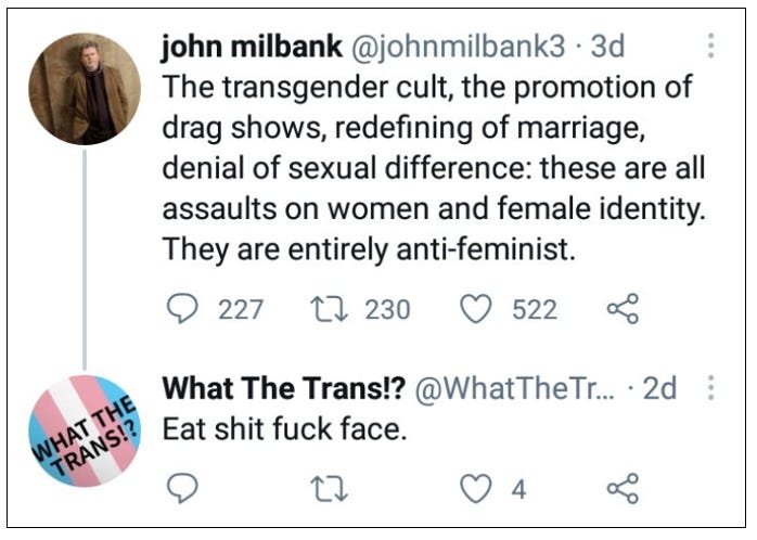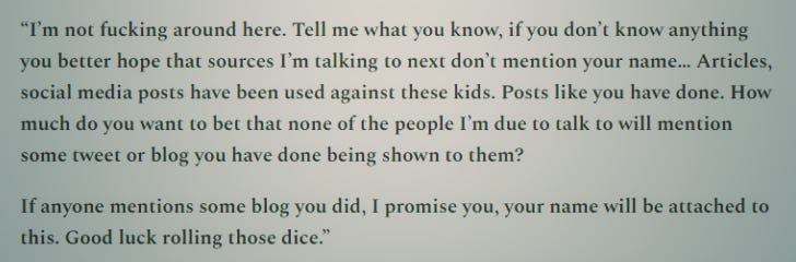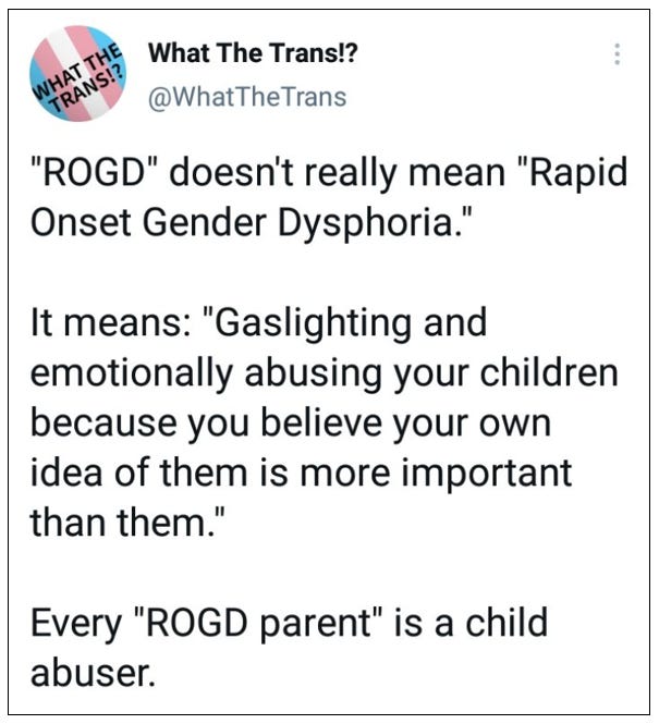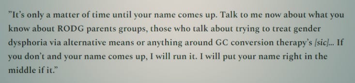 He’s also threatening to ‘expose’ blogs and social media posts by a trans adult because they may have been ‘shown’ to dysphoric children. Why a trans person isn’t allowed to write about their own experiences or how any blogger or social media user can control to whom their words are ‘shown’, he does not explain.