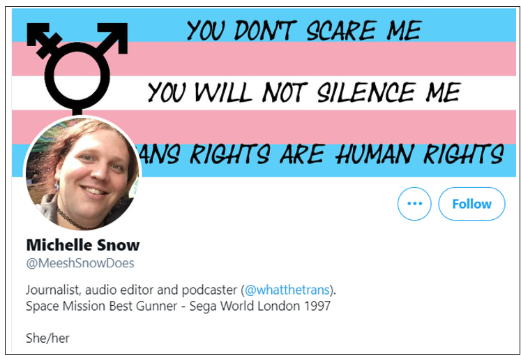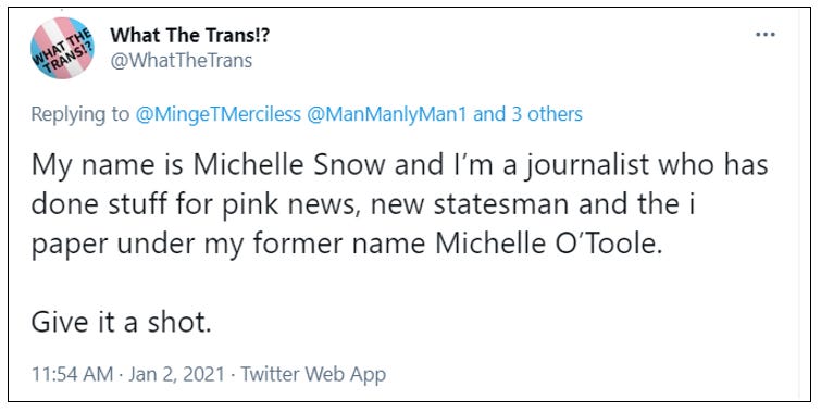 Michelle Snow is a trans identified male who runs the What The Trans podcast and its corresponding Twitter account.