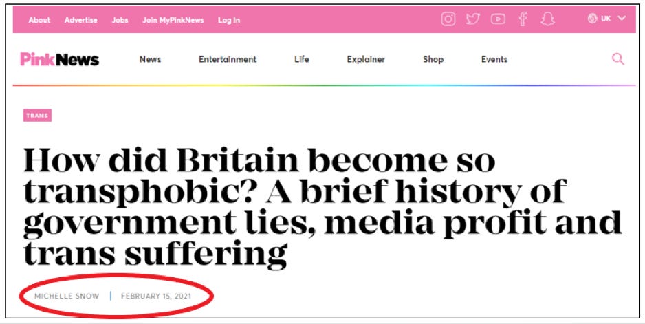 His most recent Pink News article, written under his current name, Michelle Snow, was published only a month ago.