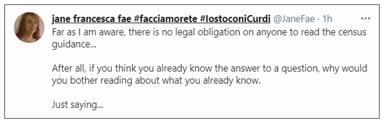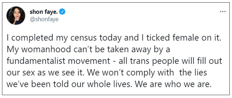 Trans activist, Shon ‘enjoy your erasure’ Faye, also seems to be advocating that people ignore the requirements and complete the census however they choose.