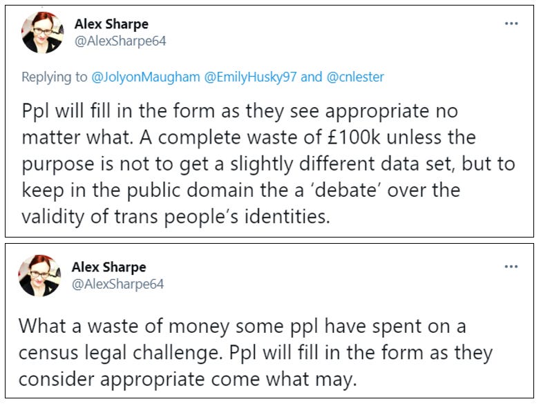 But by lying about the sex question, and then either not filling in the gender identity question or giving a silly answer, they are erasing the number of trans people, and possibly reducing any resources that might be allocated for them.