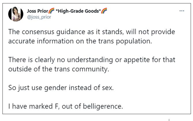 In other quarters, trans activists were not only suggesting that people will complete the census based on self-designated gender identity regardless of the requirements, but advocating that they should.