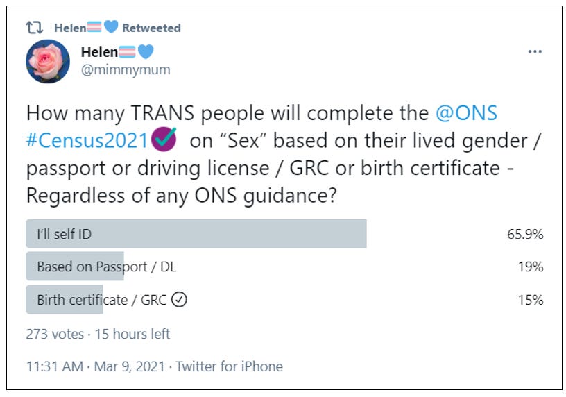 Only 15% of those answering this poll agreed they would complete the census accurately and in accordance with ONS guidelines ie record their legal sex based on the required documents. 234 people said they would lie.