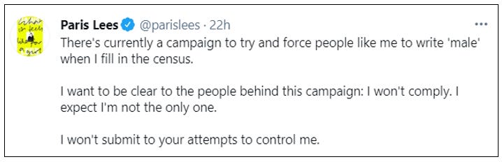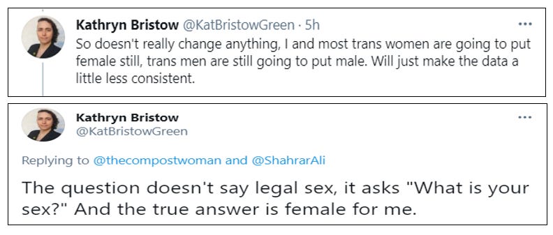 Here is Bristow, tweeting from his ‘political’ account, that he is going to record his sex as ‘female’ on the census form.