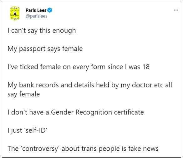 Paris Lees doesn’t have a GRC which means that he is legally male.