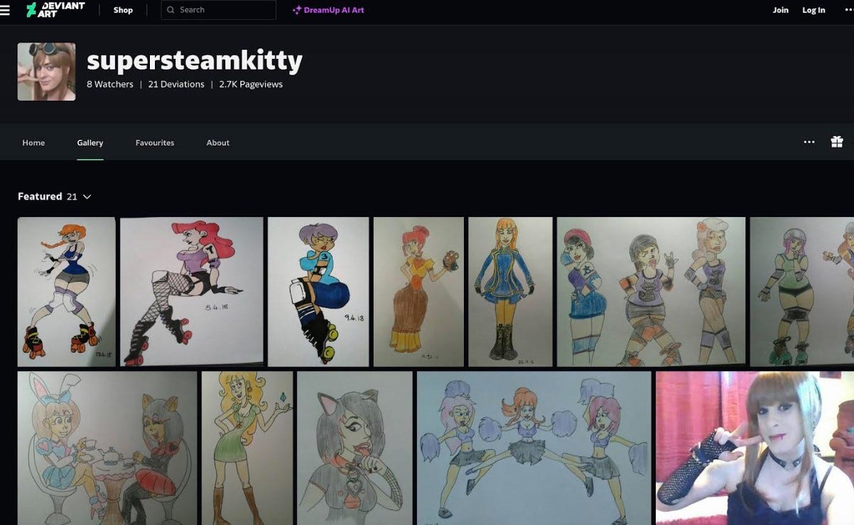 But that’s not his only creative pursuit, as any due diligence check would have shown when Stonewall was hiring. Even a cursory glance at Linfield’s Instagram account reveals him to have an alias of SuperSteamKitty whose hyper-sexualised cartoons of young women and girls appear on the website Deviant Art.
