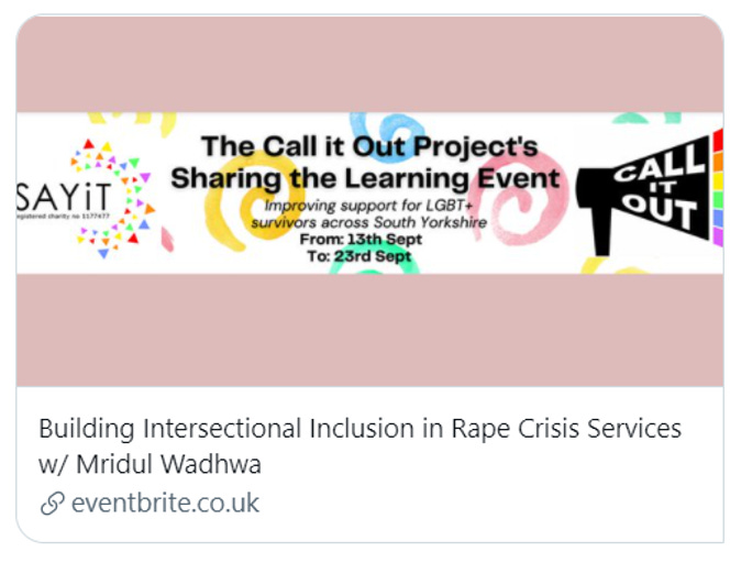 Sheffield-based SAYiT is a charity focusing on LGBT+ young people and sexual health/HIV. It is hosting a free online event at which Wadhwa will be discussing ‘intersectional inclusion in rape crisis services’.