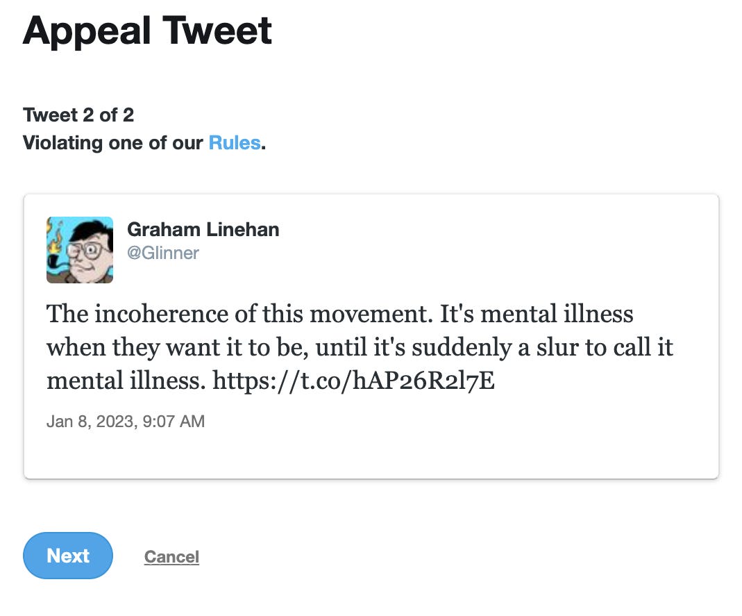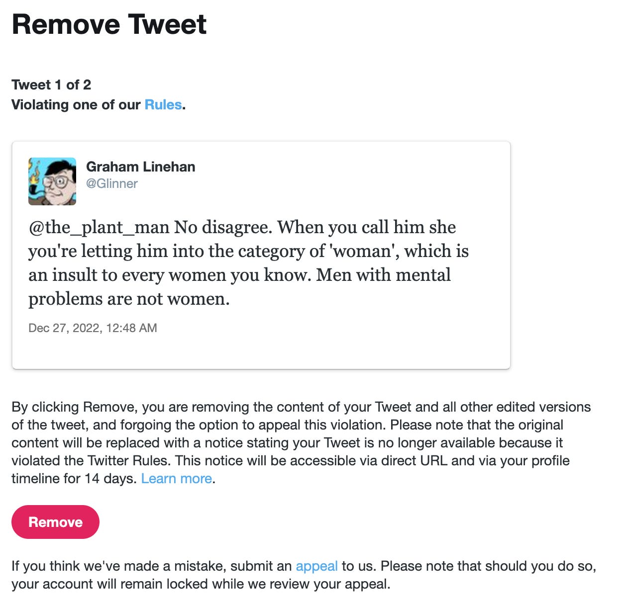 There is nothing hateful about either tweet and they’re both true, so I’d not going to delete anything. I’d appreciate it if people could request that I be reinstated.