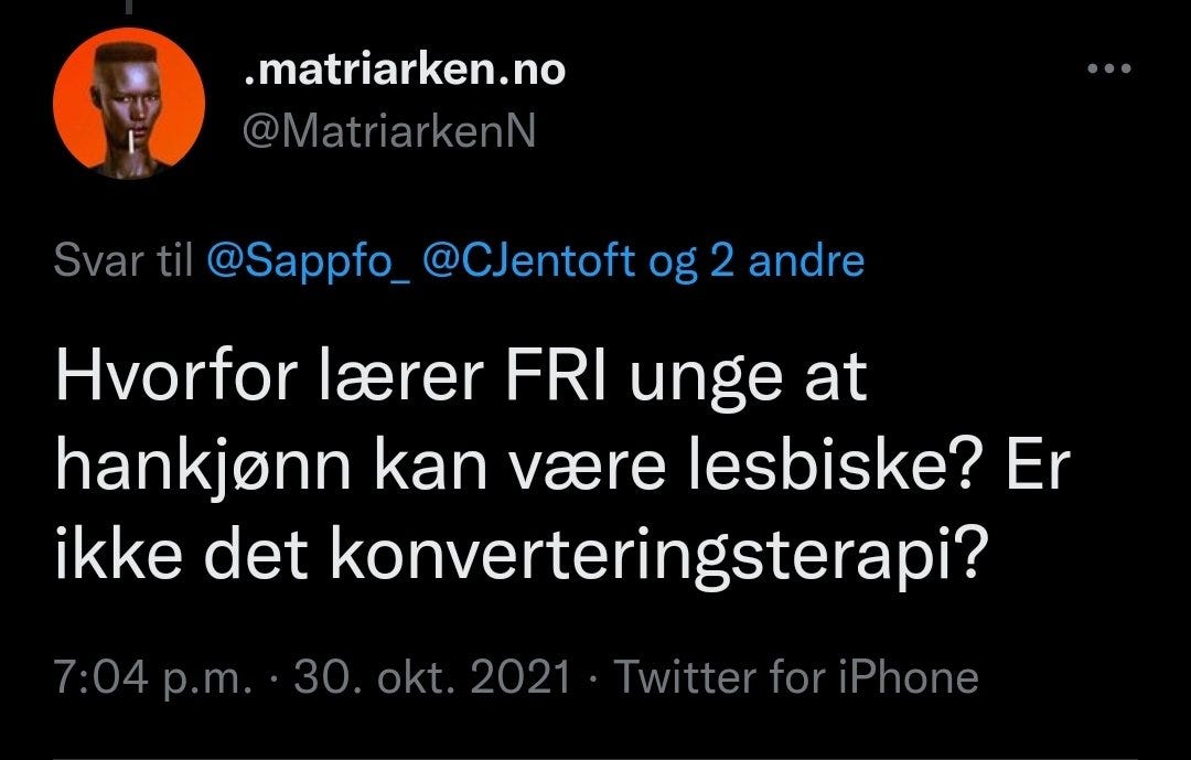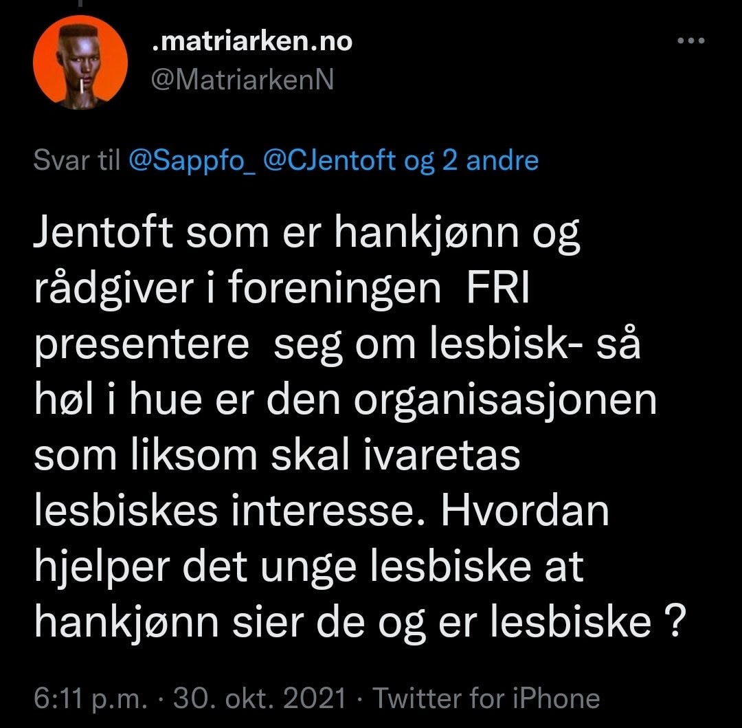 A second tweet that has been cited as evidence of hate speech reads, “Jentoft, who is male and an advisor in FRI, presents himself as a lesbian – that’s how bonkers the organization which supposedly works to protect young lesbians’ interests is. How does it help young lesbians when males claim to be lesbian, too?”