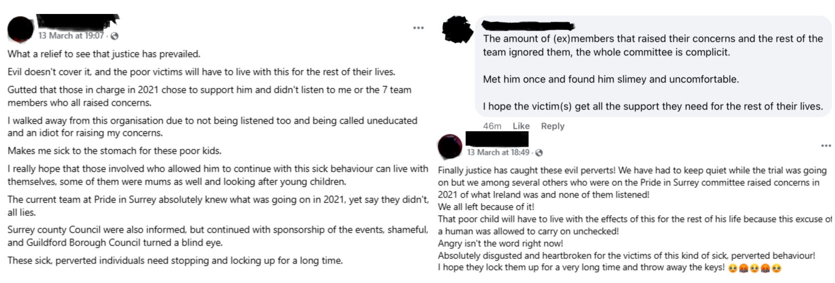 Pride in Surrey’s response to the guilty verdict was to post on Facebook that Ireland was merely an ex-volunteer. This is disingenuous. The content of his Facebook timeline reveals consistent self-promotion, persistent outreach to minors, and multiple attempts to suppress women’s safeguarding concerns.
