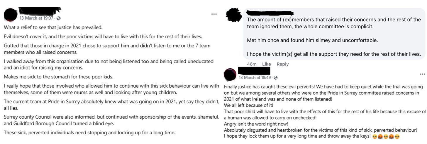 This is only a snapshot of the work Stephen Ireland put in to groom not just children but organisations that worked with children. Clearly, Pride in Surrey needs to be disbanded immediately, and investigations carried out into at least the allegations its former trustees have made. Educate & Celebrate now also needs to be properly investigated. Putting Stephen Ireland in prison is not enough. Without a deeper reckoning, the networks he groomed will remain—and so will the threat to children."