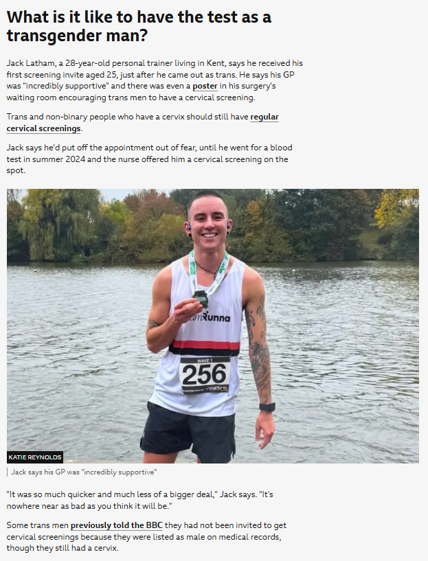 BBC News also spoke to six women about the life-saving importance of cervical screening. Five of them get a few words each but the sixth, Jack, gets an entire section of the article to herself. Simply because she says she’s a man. And this is at least the fourth time this decade that BBC News has written about cervical screening for women who pretend they are men.