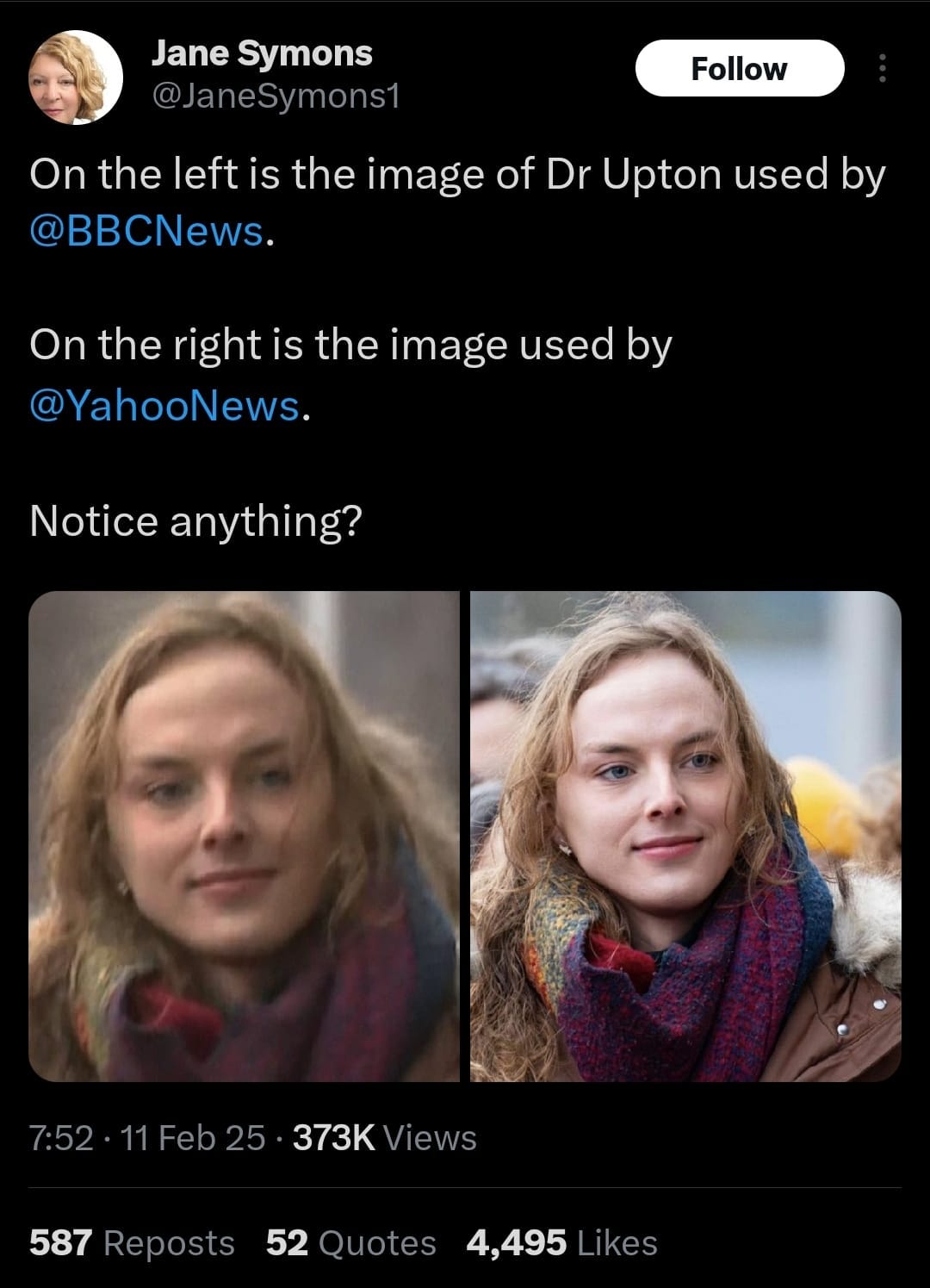 The BBC has also been accused of blurring and darkening photos of Dr Upton in order to make him look less male.
