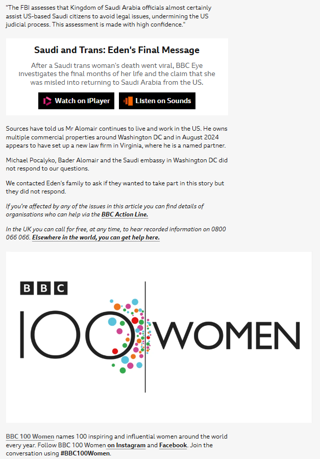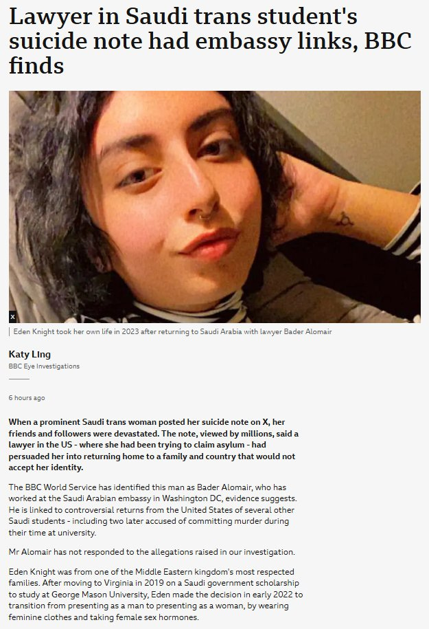 BBC News also prominently featured a story this week about a man in Saudi Arabia who took his own life in 2023, to highlight the abuse 'transgender Saudis' face. A documentary has also been made.