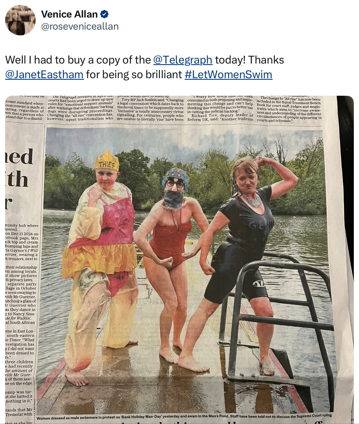 The brilliant women behind Man Friday quickly sprang back into action. They are a group of women who famously protested men being allowed into the Ladies’ Pond by identifying as men and swimming in the Men’s Pond in 2018. At the time they were escorted from the pond by police officers who politely informed them they were contravening a byelaw concerning single sex facilities.