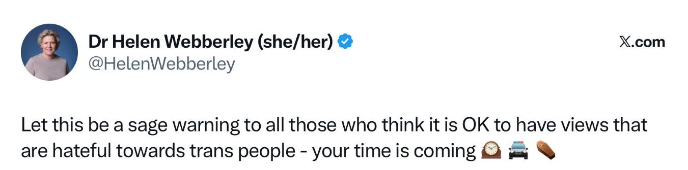 For example, before she ran into trouble with the GMC, Dr Helen Webberley, who runs a clinic that sells puberty blockers and cross-sex hormones to children, would appear on platforms such as BBC News to talk about ‘gender-affirming medical care’. After Linehan’s arrest earlier this month, she tweeted what appears to be a death threat, with ‘your time is coming’ followed by an image of a coffin.