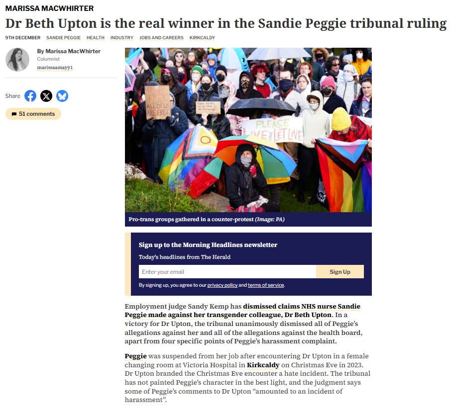 Here’s just a summary of how we got to now: Sandie Peggie is a nurse with over 30 years of experience. She was suspended from her job working in A&E at Victoria Hospital in Kirkaldy, Scotland after she confronted a male doctor in the female nurses’ changing room. The doctor, Theo ‘Beth’ Upton, ‘identifies’ as a woman and complained to management that Sandie had bullied, harassed and ‘misgendered’ him. He also claimed she had failed to provide adequate care to at least one patient due to her antipathy to him as a ‘trans woman’. Sandie brought a tribunal case against NHS Fife and Dr Upton, citing harassment and discrimination by both.