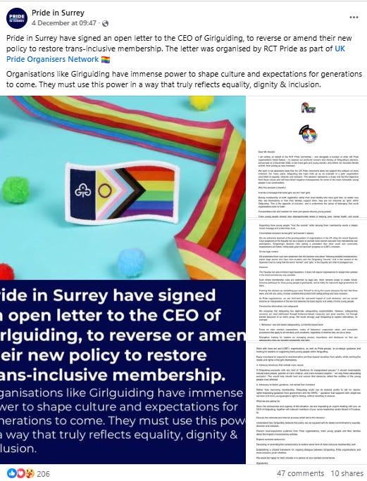 Despite spending the year being embroiled in paedophile scandals, Pride in Surrey is ending 2025 by writing to children’s organisation Girlguiding and urging it to break the law. Many of the likes were from Lib Dem councillors and other Pride organisations.