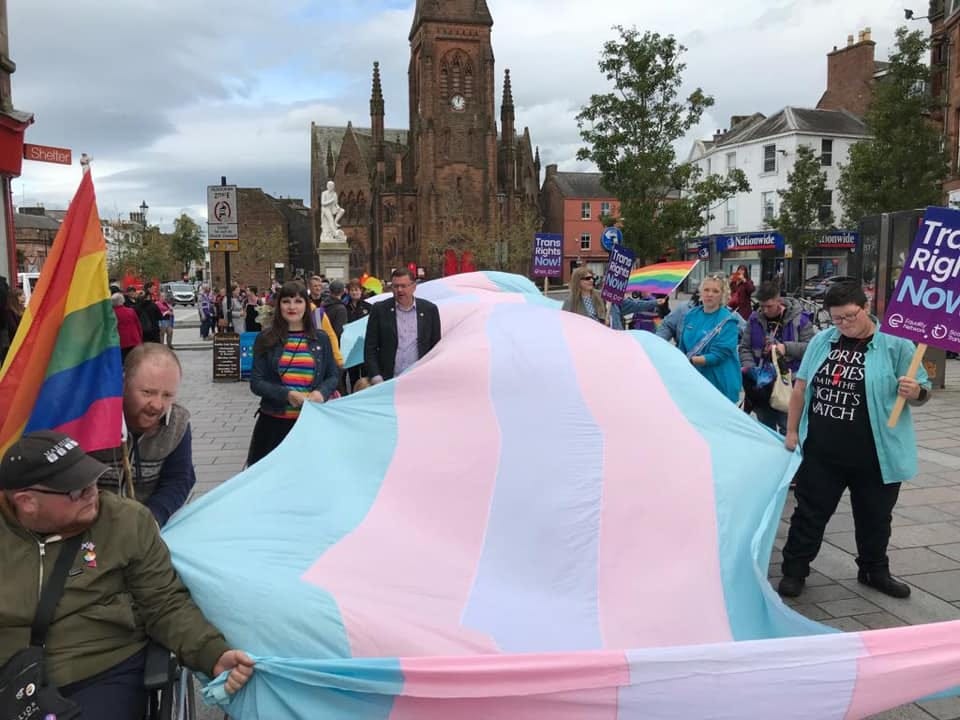 ]In 2019, Labour MSP Colin Smyth helped carry a 16 foot transgender flag, as part of a ‘trans rights’ protest. He said it was a ‘privilege’ to carry it. He later voted for self ID in Scotland.