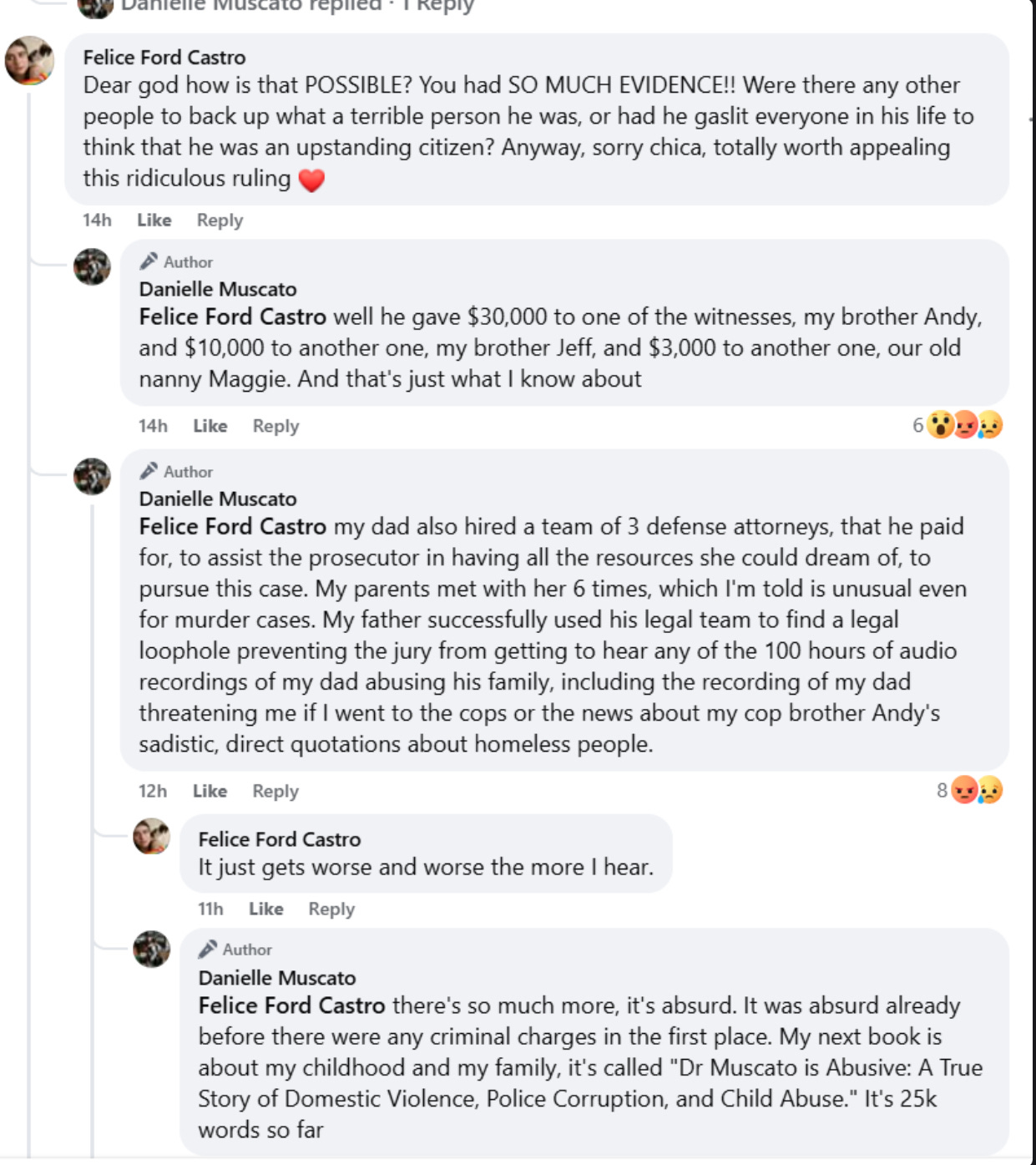 Posting on Facebook immediately after the verdict, Muscato claimed the trial was corrupt and that his parents had bribed his brothers and their former nanny to stand as witnesses for them. Neither the brothers nor the nanny actually testified in court and witness statements by them do not appear to have featured in the trial.