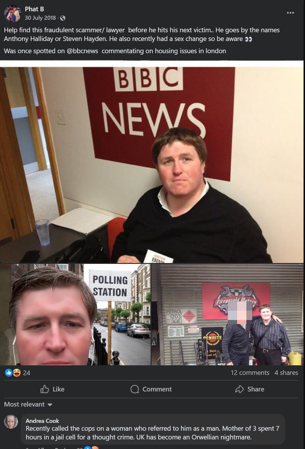 I spoke to Phat B, the author of the Facebook post, and he told me he reported it to the police, who showed no interest. So when the police first phoned me, I thought they were finally taking it seriously. Not a bit of it! They were acting on Hayden’s behalf and warned me off the story.