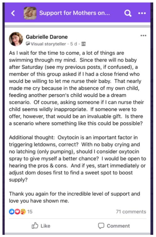 Perhaps most disturbingly, Darone is trying to solicit the loan of an infant that he can ‘breastfeed’. Oh, if only some kind woman would offer him the “invaluable gift” of allowing him to ‘feed’ her baby, it would be his '“dream scenario”.