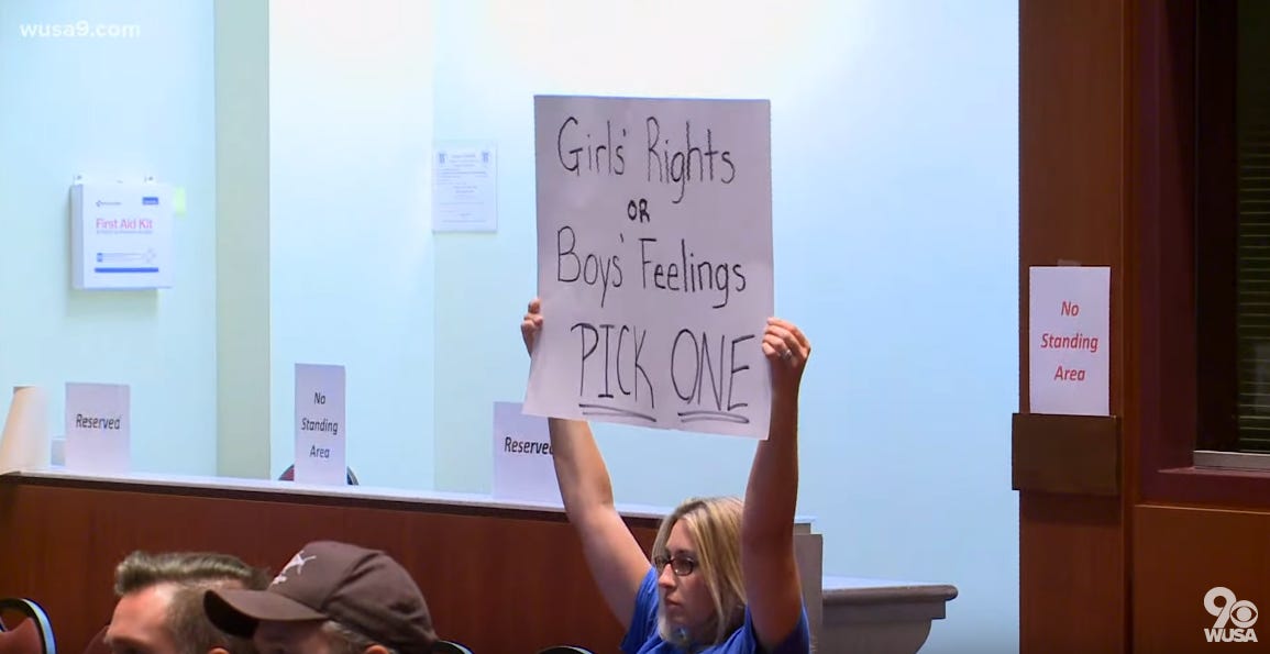 Ms. Grover also attended the school board’s vote on Wednesday, holding up a sign which read, “Girls’ rights or boys’ feelings? Pick one.”