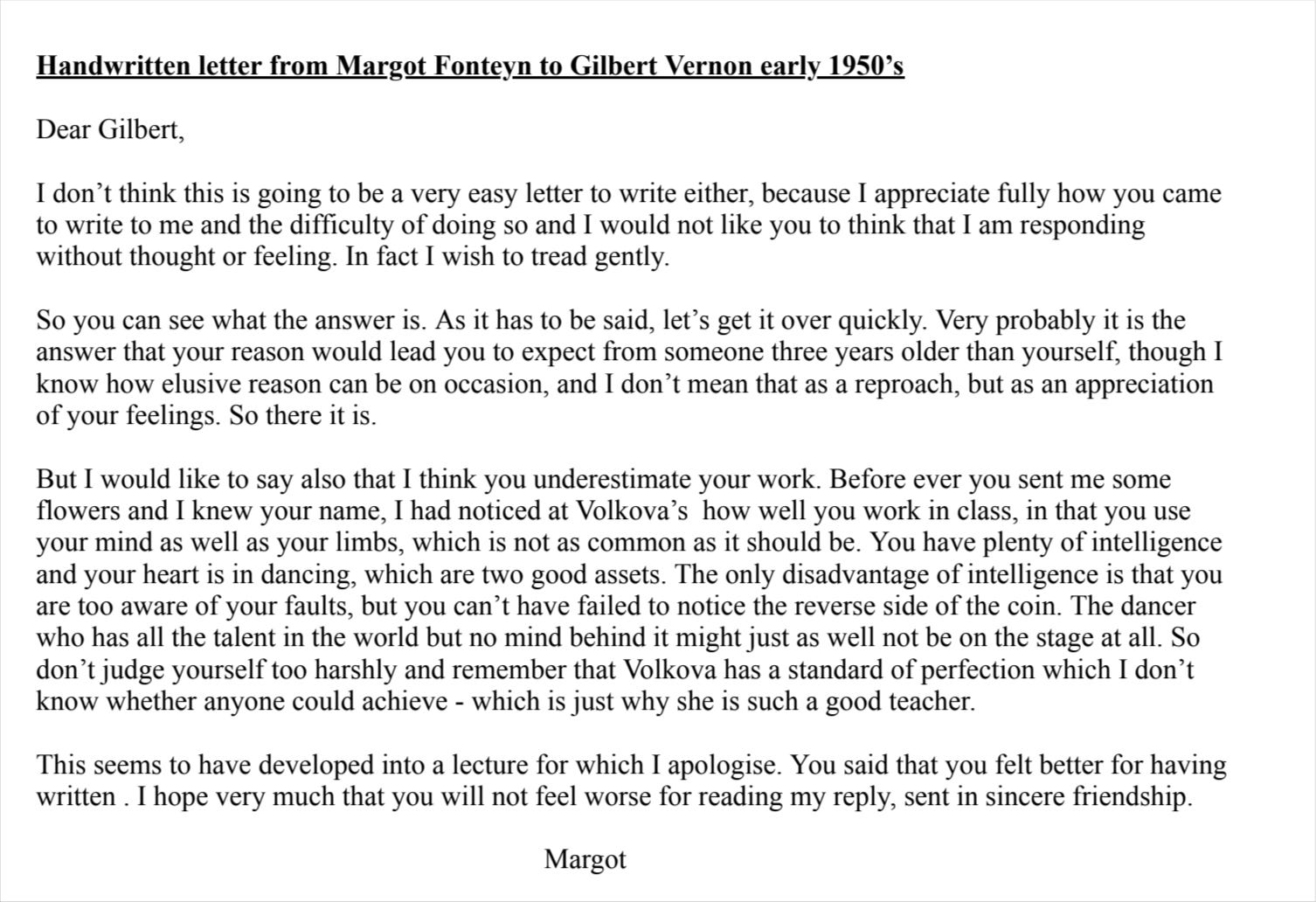 I have an 8-page letter handwritten by Margot Fonteyn in the early 50’s to a (gay) male dancing colleague kindly declining his proposal of marriage. It’s worth a fair bit. I put it into an auction a few years ago for a suggested price of £600, but someone advised me I could probably find a devotee who’d pay much more. Anyway, if you’re interested, I’d like you to have it to give your income a bit of a boost. Let me know.