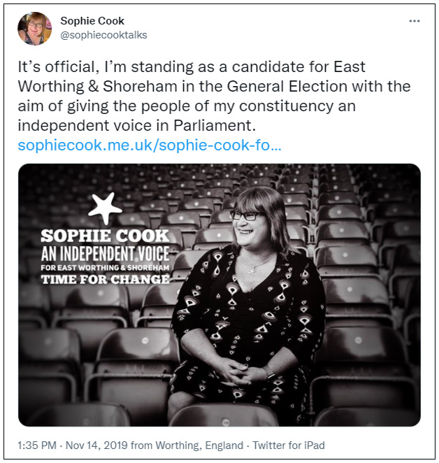 The same year Cook was, again, shortlisted as a candidate for the Worthing and Shoreham seat. He was supported by both Momentum and the Unite Union.