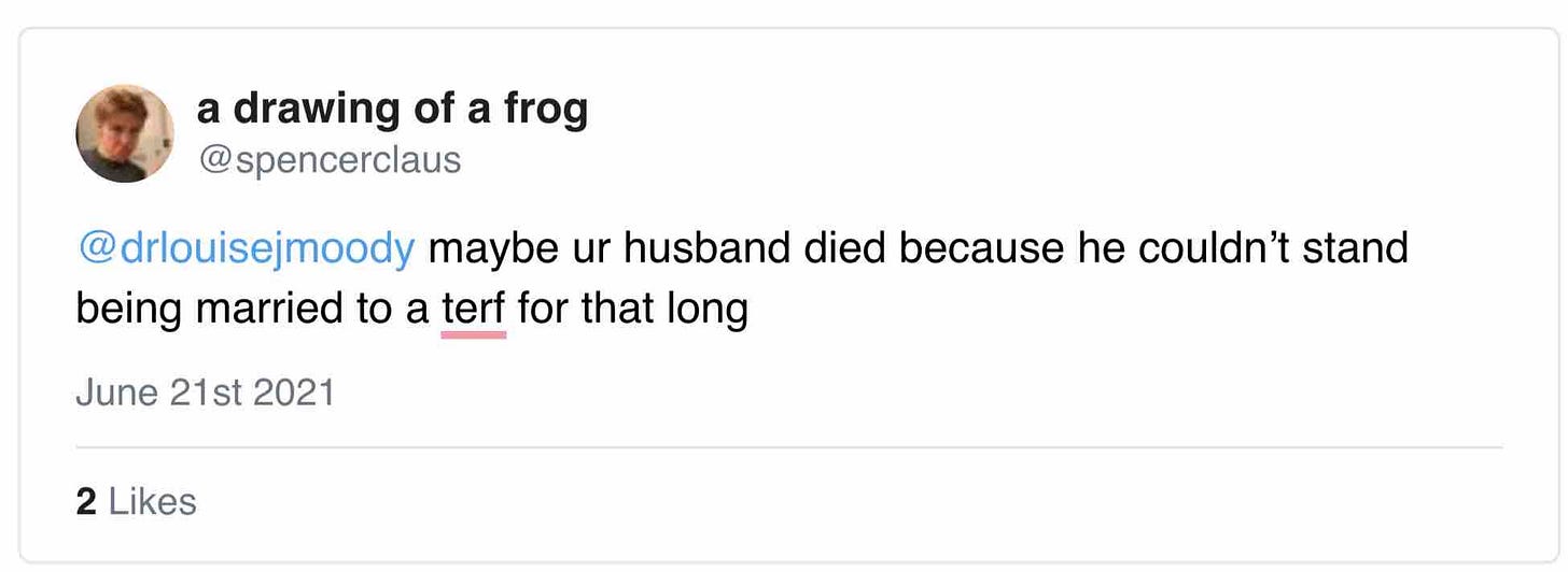 So successful is the linguistic dehumanisation of feminists that this blue-ticked prick gets to say foul shit to a woman whose partner recently died, while an important feminist like Meghan Murphy is permanently banned.