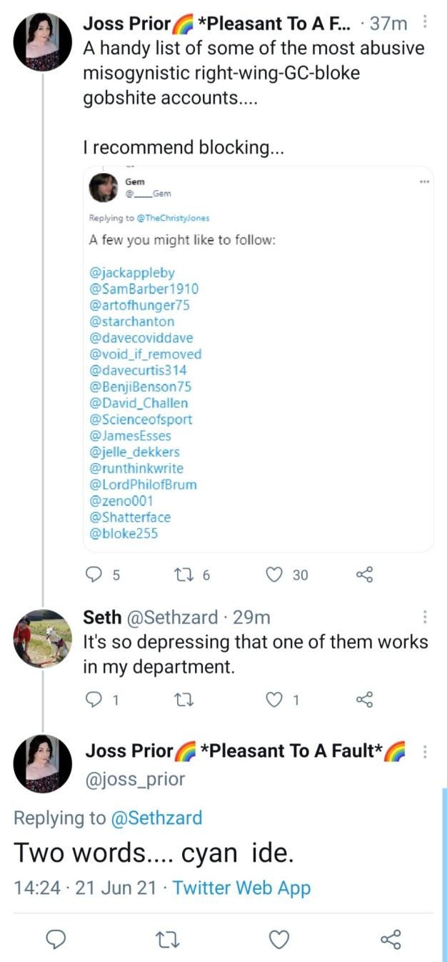 It is profoundly ignorant to talk about “both sides” needing to tone down the rhetoric in this debate. There is only one side that sends death and rape threats, only one side that tries to destroy livelihoods, only one side motivated so transparently by misogyny, envy and spite. If you see someone taking the ‘both sides’ trope out for a trot, ask them to produce anything by me, Jess De Wahls, JK Rowling or Maya Forstater, or any other gender critical person, that even comes close to the poisonous filth produced by the men above.