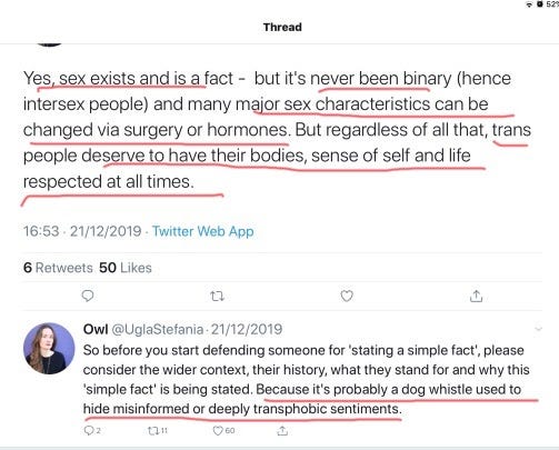 The document is introduced by a well known Trans Activist based in the U.K. They identify as non-binary and are in a relationship which we would normally describe as heterosexual but which now meets the criteria for inclusion as “queer” as both parties claim a trans-identity. Here is a sample of their contribution to the debate about Sex versus Gender. Simple facts may be “transphobic dogwhistles” 👇