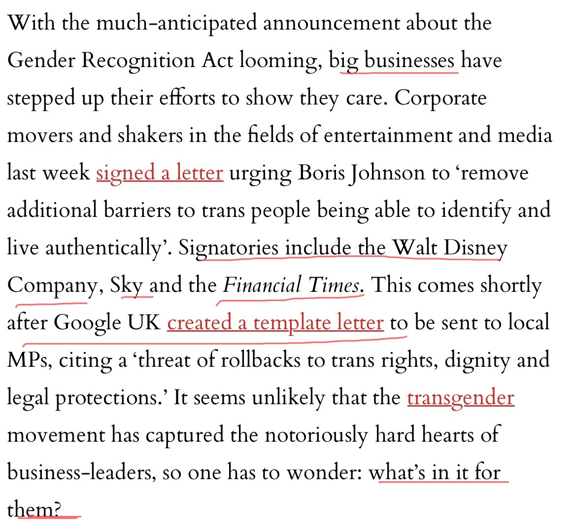 Hi Graham. Something that bugs me - the statement that the Financial Times signed the group letter in support of the amendments to the GRA, which was sent to Boris Johnson. I subscribe to the FT and I can't find any mention of this letter in the FT itself. You'd think that if they had signed a letter they'd mention it in an editorial somewhere. Moreover, unlike the Guardian, or the Indie, the FT has never indicated support for the trans ideology. On the contrary there have been a couple of articles expressing mild concern. So, I'd really like to know who at the FT signed this letter and what their authority was to do so.