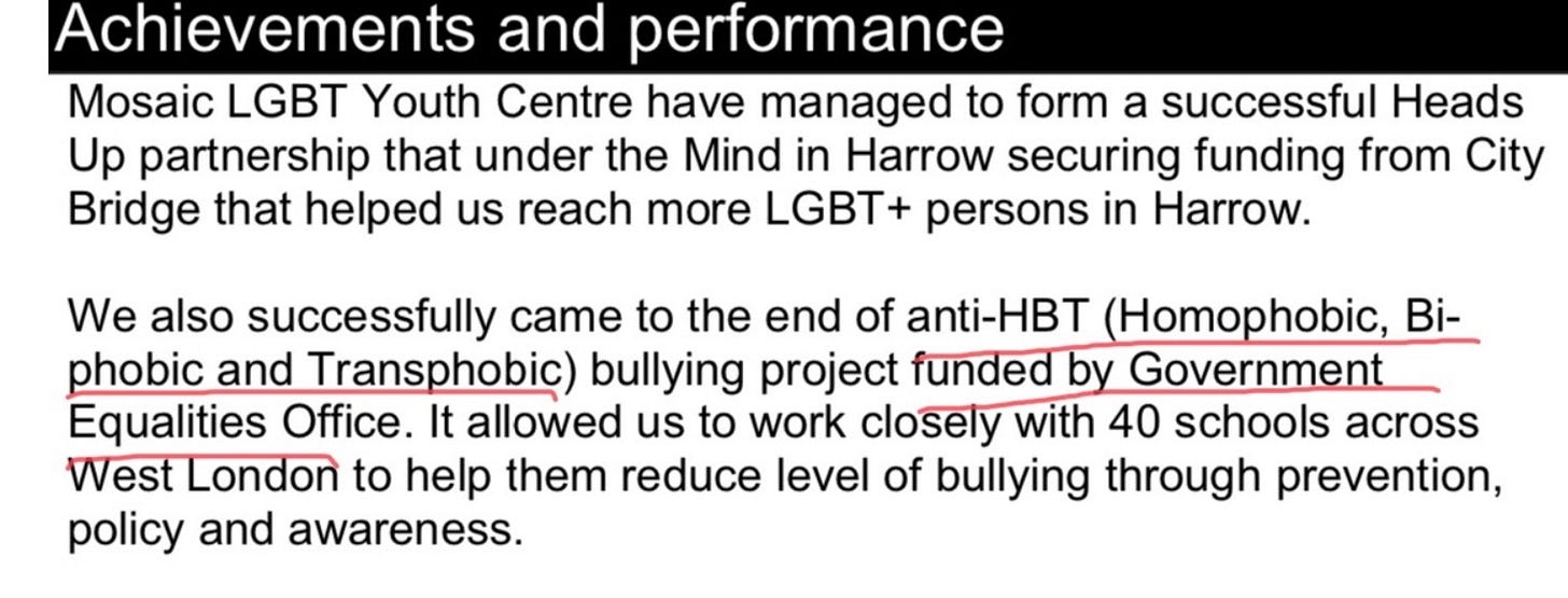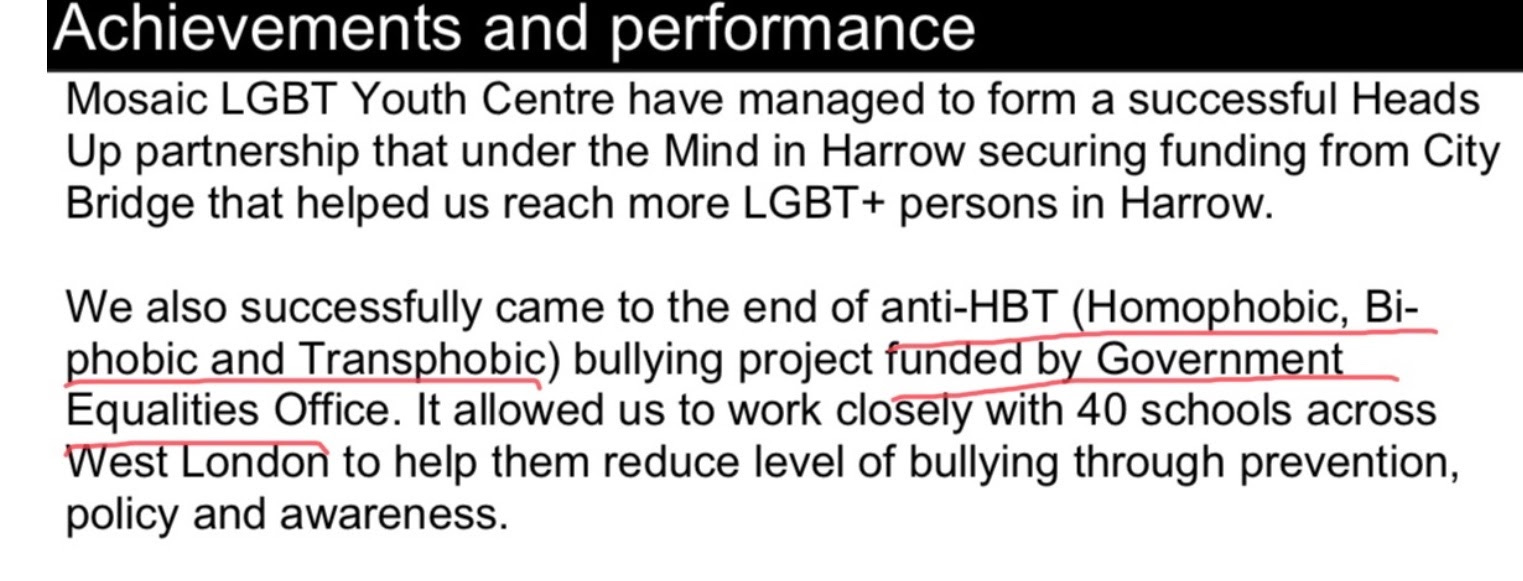 Mosaic has an online presence and, as a charity, they are obliged to submit accounts. These confirm the organisation was involved in a project to combat homophobia, biophobia and transphobia in schools. This project was funded by the Government Equality Office.