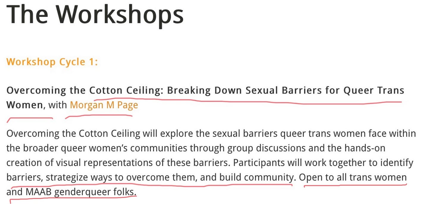 However, Alex is not the most egregious example from the Stonewall stable. Morgan Page ran a male-only (MAAB = Male assigned at birth) course on overcoming the “cotton ceiling”. The term is a play on “glass ceiling” and the cotton refers to the underwear of women. This tends to focus particularly on lesbians who have the temerity to reject males who claim a female identity as sexual partners.