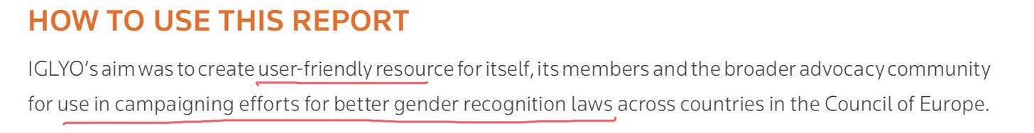The document is intended as a resource for activists to better lobby for “gender recognition” laws, otherwise known as ‘Self ID’. It outlines the most successful campaign tactics used across Europe.